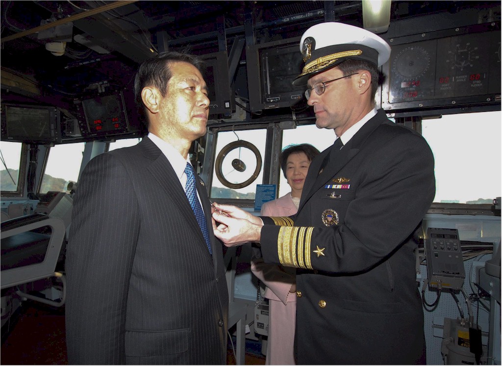 | 186k | 100119-N-5086M-024. U.S. Navy Vice Adm. John M. Bird, commander of U.S. 7th Fleet, pins the Legion of Merit medal on retired Japanese Vice Adm. Tohru Izumi Jan. 19, 2010, during a pinning ceremony in Yokosuka, Japan, aboard USS Lassen (DDG 82). During the ceremony, Izumi, who is the former commander in chief of the Japanese Maritime Self-Defense Forces Self-Defense Fleet, was recognized for his commitment to the U.S.-Japanese Alliance. DoD photo by Mass Communication Specialist 2nd Class Greg Mitchell, USN. | Robert M. Cieri |