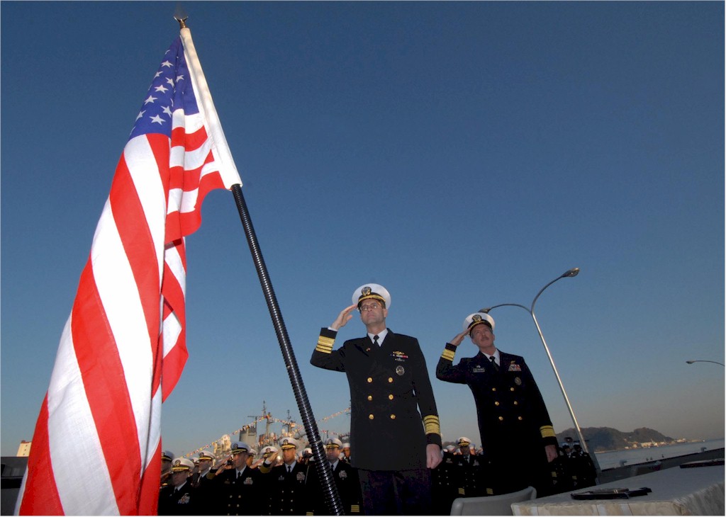 | 120k | 100119-N-5086M-080. U.S. Navy Vice Adm. John M. Bird, commander of the U.S. 7th Fleet, and Rear Adm. Richard M. Wren, commander of Naval Forces Japan, salute the U.S. flag during the ceremony commemorating the 50th anniversary of the alliance between the United States and Japan Jan. 19, 2010, in Yokosuka, Japan. USS Lassen (DDG 82) joined JS Oonami (DD 111) pierside in a ship exchange and joint colors ceremony commemorating the Jan. 19, 1960, signing of the Treaty of Mutual Cooperation and Security between the U.S. and Japan. U.S. Navy photo by Mass Communication Specialist 2nd Class Greg Mitchell. | Robert M. Cieri |