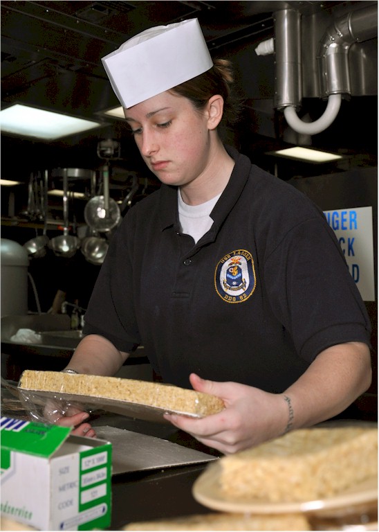 | 94k | Yokosuka, Japan, December 28 2009, Fire Controlman 3rd Class Teuja Seibold, from Atlanta, wraps desserts while preparing lunch aboard the Arleigh Burke-class guided-missile destroyer USS Lassen (DDG 82). Lassen is one of seven Arleigh Burke-class guided-missile destroyers assigned to Destroyer Squadron 15, and is permanently forward-deployed to Yokosuka, Japan. U.S. Navy Photo by Mass Communication Specialist 3rd Class Charles Oki. | Bill Gonyo |