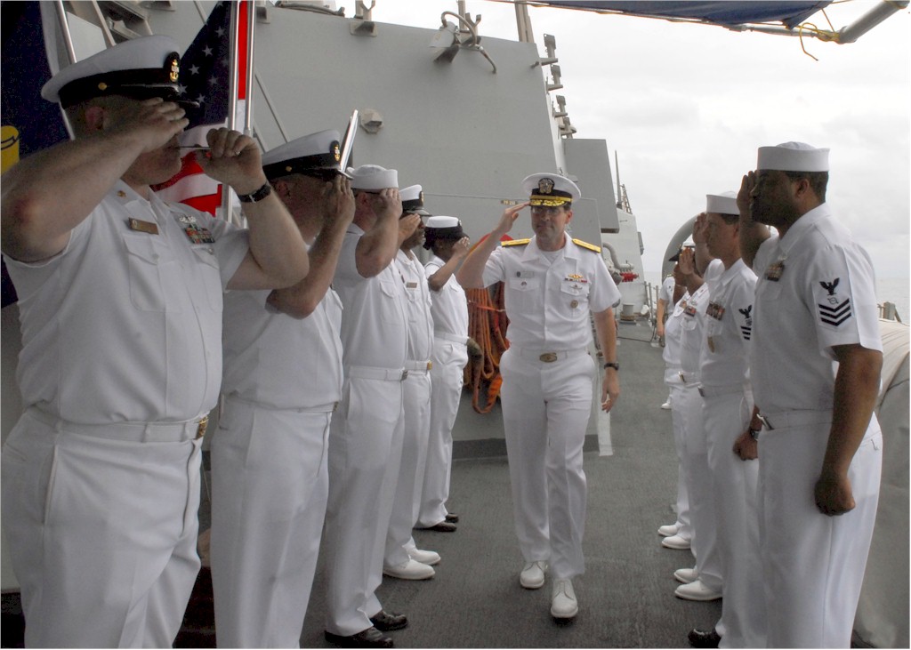 | 143k | 090131-N-2013O-009. Bali, Indonesia, January 31 2009, sailors assigned to the Arleigh Burke-class guided-missile destroyer USS Lassen (DDG 82) render honors for Vice Adm. John M. Bird, commander, U.S. 7 Fleet. Lassen, assigned to Destroyer Squadron 15, is in Bali for a scheduled port visit. U.S. Navy photo by Mass Communication Specialist Seaman Charles Oki. | Bill Gonyo |