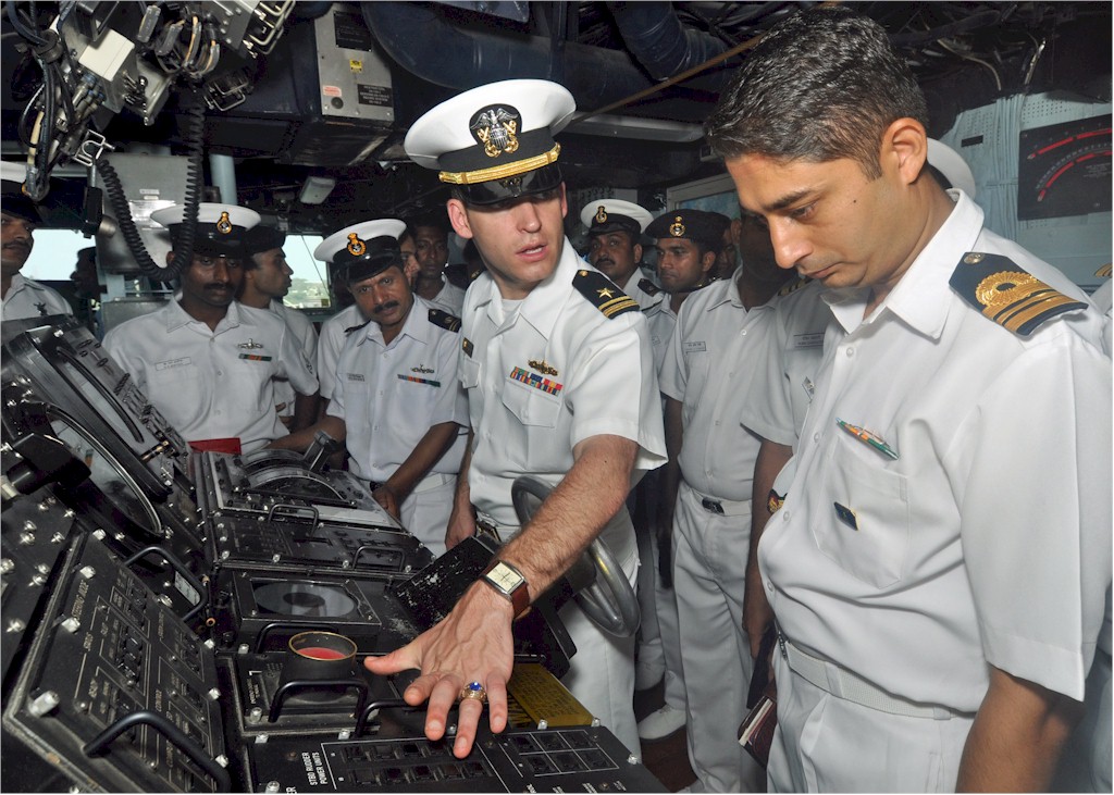| 216k | Goa, India, April 24 2010, Lt. j.g. Doug Gates, a Washington D.C. native assigned to the Arleigh Burke-class guided-missile destroyer USS Lassen (DDG 82) describes the functions of the helm to members of the Indian Navy during a tour aboard Lassen in Goa, India. Lassen is assigned to Destroyer Squadron 15 and is in Goa, India for a port visit. U.S. Navy photo by Mass Communication Specialist 3rd Charles Oki. | Bill Gonyo |