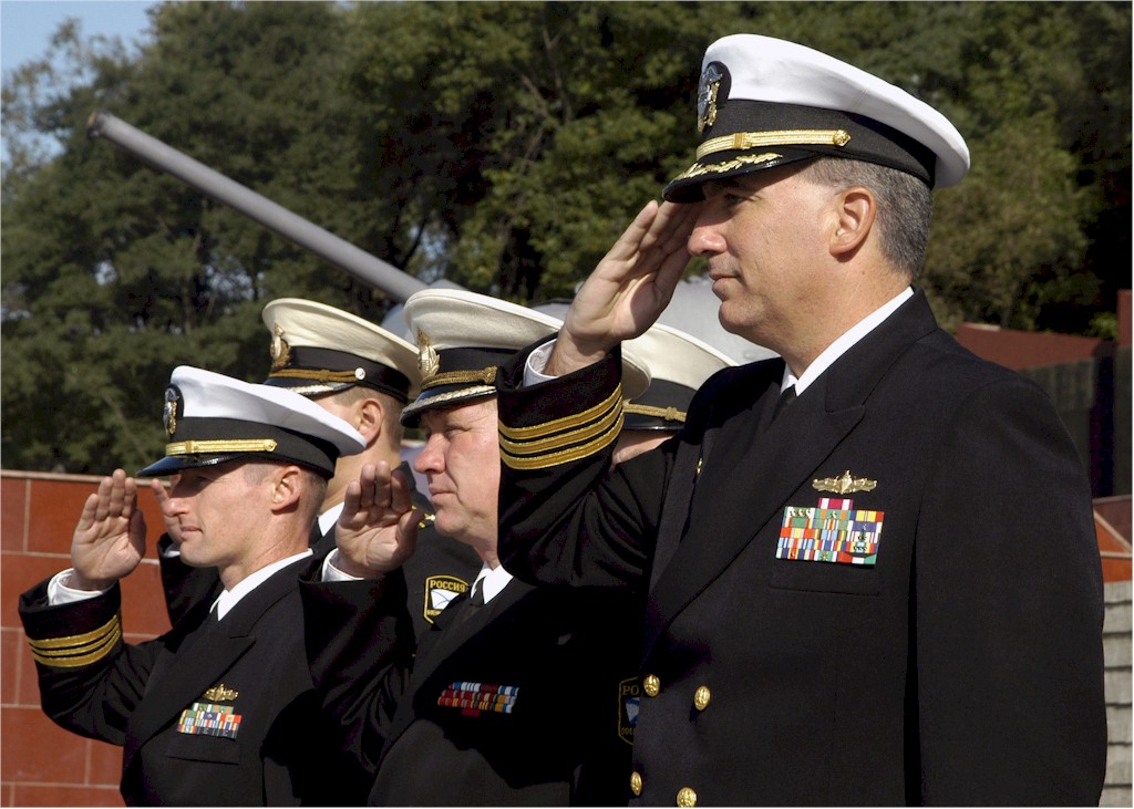| 178k | Vladivostok, Russia, September 25 2007, Cmdr. Marshall B. Brown, commanding officer of Arleigh Burke-class guided-missile destroyer USS Lassen (DDG 82), salutes as the national anthem is played during a wreath laying ceremony. Sailors assigned to Lassen, mine warfare ship USS Patriot (MCM 7) and the Russian Federated Navy participated in the ceremony to commemorate those who gave their lives during World War II. Lassen and Patriot are in Vladivostok to participate in exercise Pacific Eagle, a bilateral exercise with the Russian Federated Navy. U.S. Navy photo by Mass Communication Specialist 2nd Class Chantel M. Clayton, 070925-N-4649C-034. | Bill Gonyo |