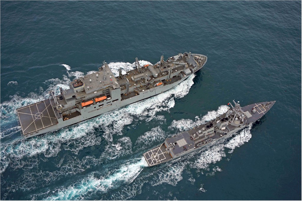 | 117k | Undated, steaming in the South China Sea USS Lassen (DDG-82), right, receives fuel from the Military Sealift Command dry cargo and ammunition ship USNS Amelia Earhart (T-AKE 6) during an underway replenishment. US Navy Photo. | Tommy Trampp |