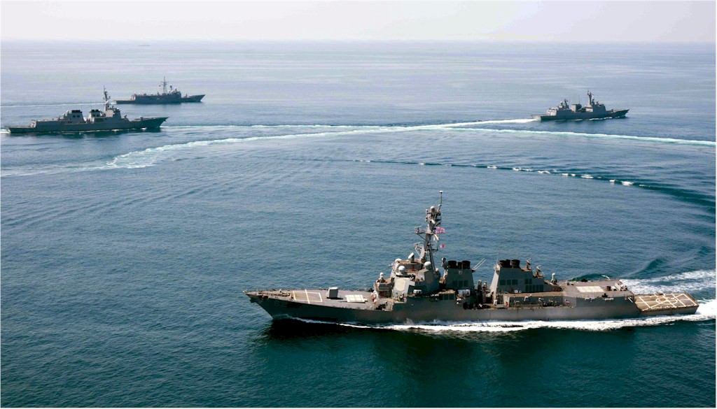 | 157k | 150525-N-ZZ999-006. Waters to the South of the Korean Peninsula, May 25 2015, the Arleigh Burke-class guided-missile destroyer USS Lassen (DDG 82), front, conducts a trilateral naval exercise with the Turkish frigate FTCD Gediz (F-495) and Republic of Korea navy destroyers Seoae Ryu Seong-ryong (DDG 993) and Gang Gam-chan (DDH 979) in support of theater security operations. Lassen is on routine patrol in the U.S. 7th Fleet area of operations in support of security and stability in the Indo-Asia-Pacific region. U.S. Navy photo by Naval Air Crewman (Helicopter) 2nd Class Evan Kenny. | Ron Reeves |
