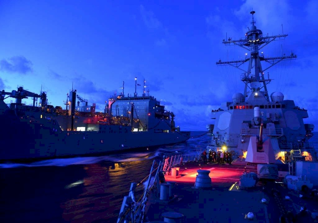 | 198k | 160222-N-MD297-180. Pacific Ocean, February 22 2016, The Arleigh Burke-class guided-missile destroyer USS Lassen (DDG-82), left, takes on fuel from the Military Sealift Command (MSC) fleet replenishment oiler USNS Guadalupe (T-AO-200) off the coast of Southern California during an underway replenishment (UNREP). Lassen departed Yokosuka, Japan, 6 January 2016, for her new homeport of Mayport, Florida, after serving nearly 10 years as part of the Forward Deployed Naval Forces. US Navy photo by Mass Communications Specialist Second Class Huey D. Younger Jr. | Lee Wahler |