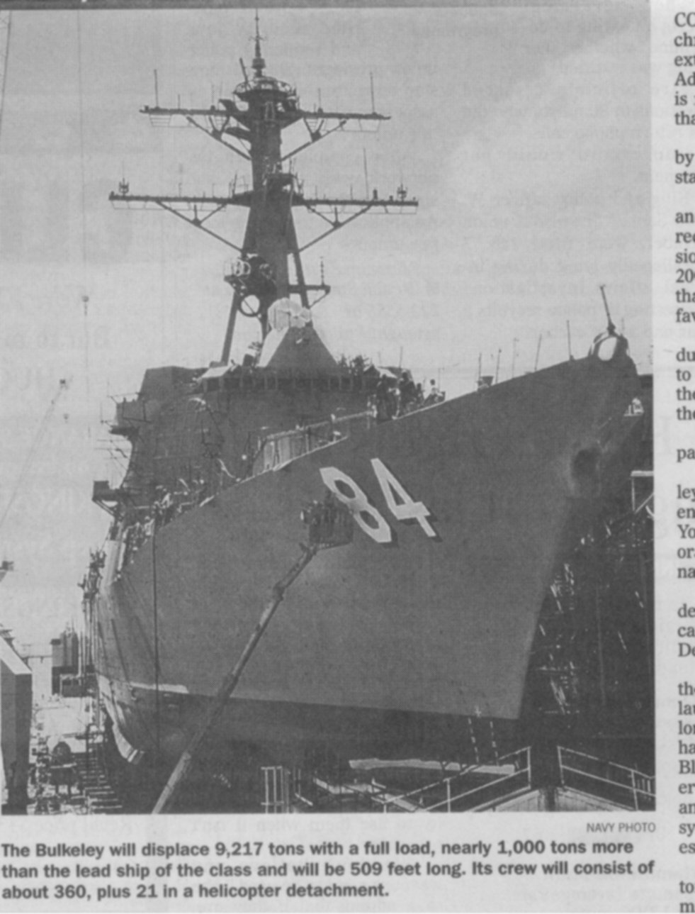 73k | Commercial tugboats moved the newly launched Arleigh Burke Class, Block IIA Aegis Destroyer USS BULKELEY (DDG 84) to the fitting out basin at the Litton Industries Shipyard, Pascagoula, Mississippi. 14 JUN 2000. | Surface Warfare Magazine website |
