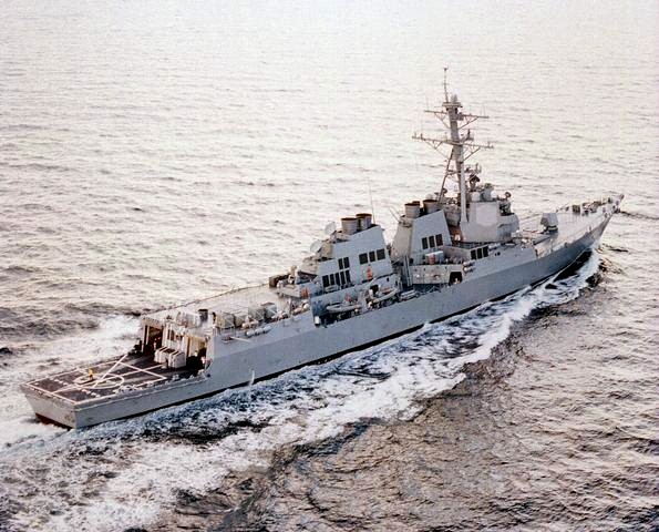 48k | 040421-N-5319A-005. Arabian Gulf April 21 2004, the guided missile destroyer USS Bulkeley (DDG 84) steams along in the Arabian Gulf while participating in exercises aimed at fighting the global war on terrorism. The Norfolk, Va. based Arleigh Burke class guided missile destroyer is on a