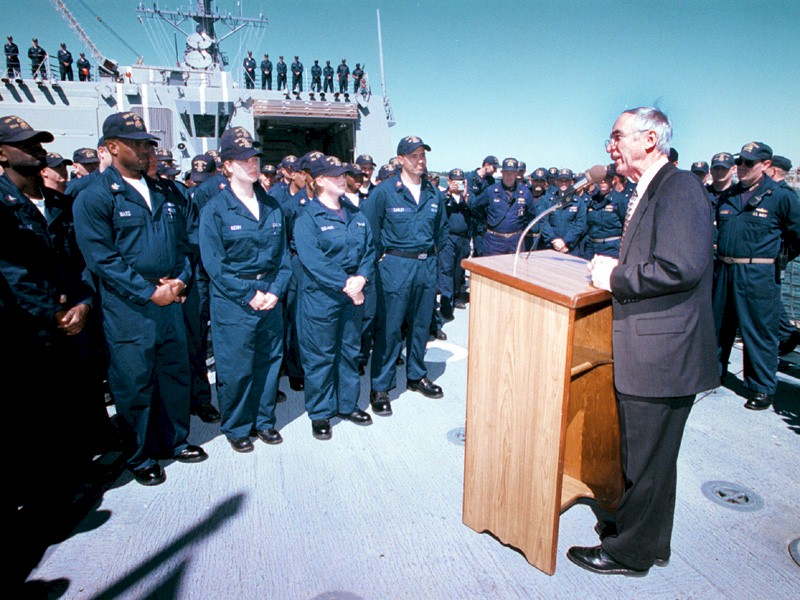 157k | Pascagoula, Miss., September 27 2001, The Secretary of the Navy addresses Sailors on board the destroyer Bulkeley, (DDG 84), during a visit to Ingalls Shipbuidling, Pascagoula, Miss. Secretary England also spent time in New Orleans to visit with leadership at Navy and Marine Corps Reserve Headquarters as well as visit several Navy commands in the area. Bulkeley is at Ingalls Shipbuilding getting its final fit out prior to commissioning. [010927-N-5636P-003] | Bill Gonyo |