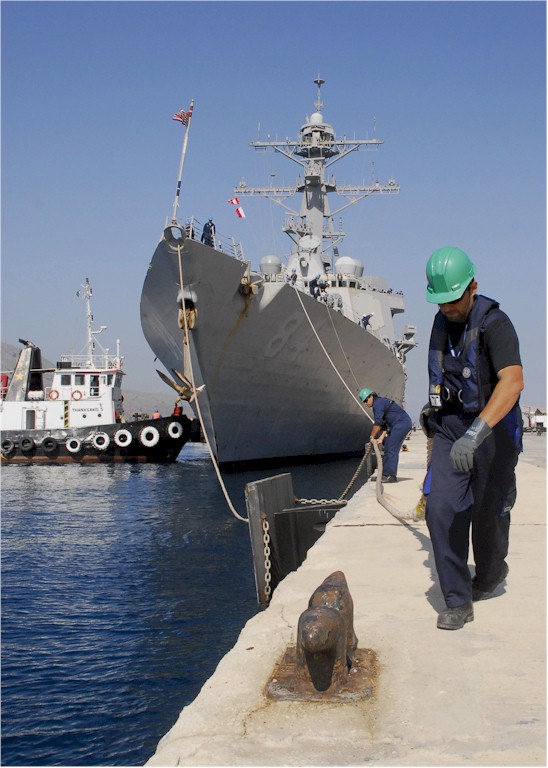| 102k | 080605-N-0780F-002. Souda Bay, Crete, Greece, June 5 2008, line handlers assist with mooring operations as the guided-missile destroyer USS Bulkeley (DDG 84) arrives at Naval Support Activity Souda Bay in Souda harbor for a routine port visit. Bulkeley, with a crew of 380, departed her homeport of Norfolk, Va., in February as part of the USS NASSAU Expeditionary Strike Group. U.S. Navy photo by Paul Farley. | Robert M. Cieri |