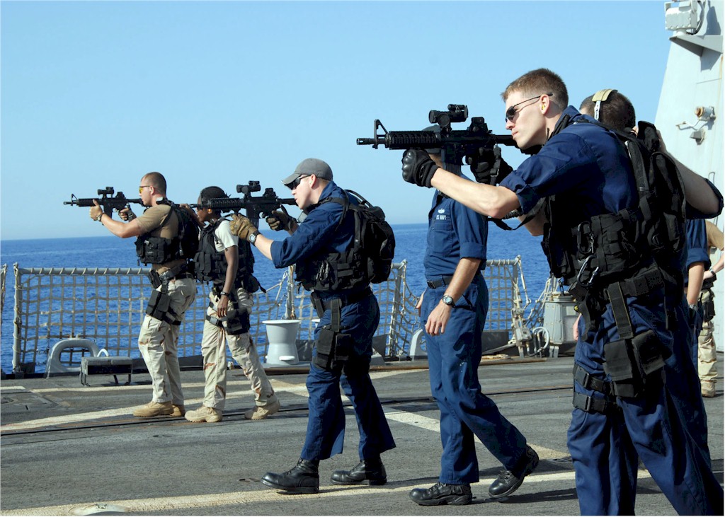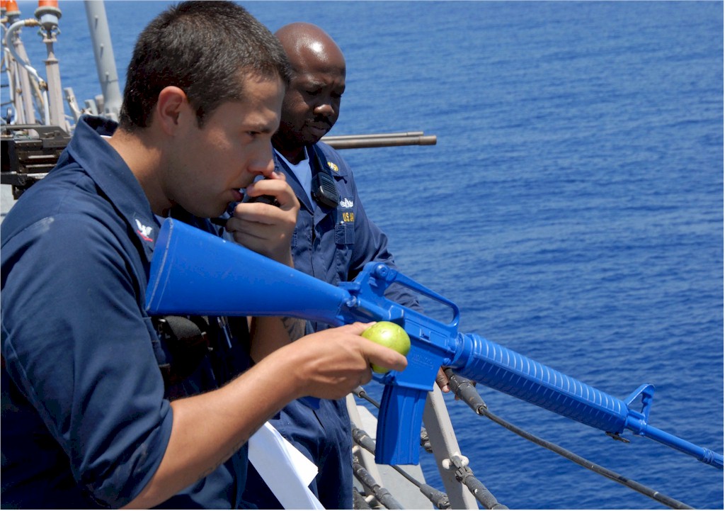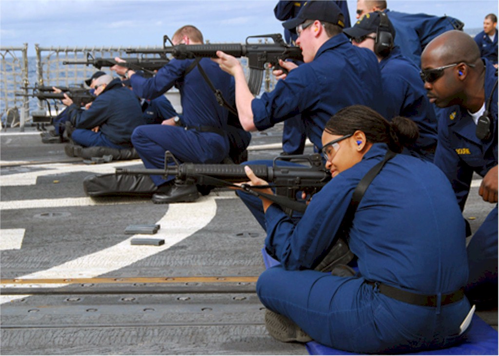 | 203k | 080619-N-2838W-025. Mediterranean Sea, June 19 2008, members of the visit, board, search and seizure (VBSS) team aboard the guided-missile destroyer USS Bulkeley (DDG 84) practice essential gun-firing procedures with the MK-18 rifle. VBSS teams play a vital role in maritime security operations all around the world. Bulkeley is one of six vessels of the Nassau Strike Group operating in the Navy's 6th Fleet area of responsibility supporting maritime security operations. U.S. Navy photo by Mass Communication Specialist 3rd Class David Wyscaver. | Bill Gonyo |