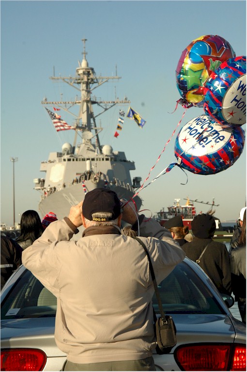 100k | 061206-N-6439C-005. Naval Station Norfolk, December 6 2006, Clete Roh, grandfather of Ensign Lindsey Windham aboard the guided-missile destroyer USS Bulkeley (DDG 84), looks for his granddaughter through his binoculars pierside. Iwo Jima Expeditionary Strike Group returns to their homeport after completing a six-month deployment, which included assisting in the evacuation of American citizens out of Lebanon in the U.S. Central Command (CENTCOM) 5th Fleet area of responsibility U.S. Navy photo by Mass Communication Specialist Seaman Amanda Clayton. | Robert M. Cieri |