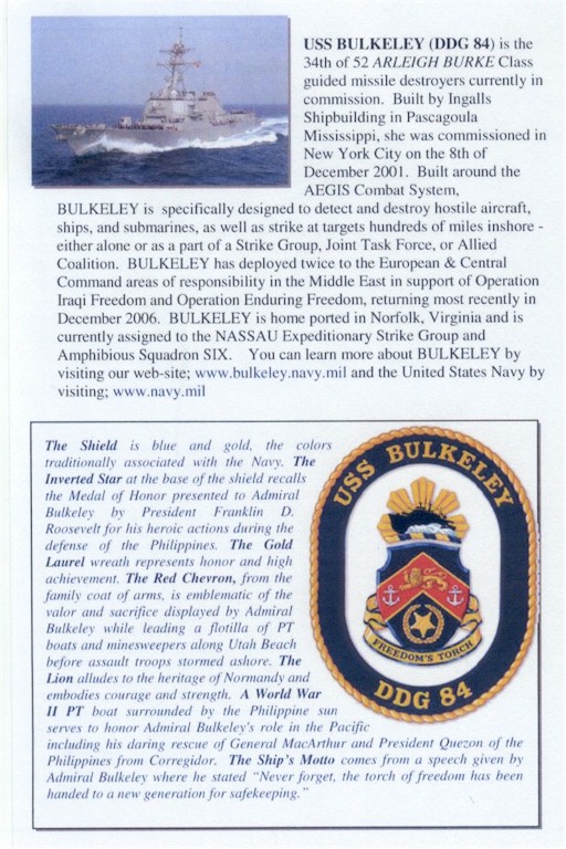 | 190k | The U.S. Navy christened this Arleigh Burke class guided-missile destroyer on June 24, 2000 at Litton's Ingalls Shipbuilding in Pascagoula, Miss. DDG-84 was named in honor of Navy Vice Adm. John Duncan Bulkeley, (1911-1996). Bulkeley received the Medal of Honor, Navy Cross, and numerous other decorations for his heroic actions during World War II. This illustration captures items from throughout his naval career. He’s pictured (top left) from his days as a Naval Academy Midshipman and as a Vice Admiral. The lower left corner shows PT 41 and the PT 35 motor torpedo boats, which Bulkeley commanded to evacuate Army Gen. Douglas MacArthur and President Quezon from the Philippines. He destroyed several Japanese planes, surface combatants, and merchant ships. The ship pictured in the center right of the drawing is the destroyer USS Endicott (DD-495), which Bulkeley commanded during the invasion of Southern France - sinking the German Corvettes Nimet Allah and Capriola. Following the war, he became president of the Board of Inspection and Survey (as depicted top right). Illustration by Peter K. Hsu of Anteon Corporation. | Bill Gonyo |