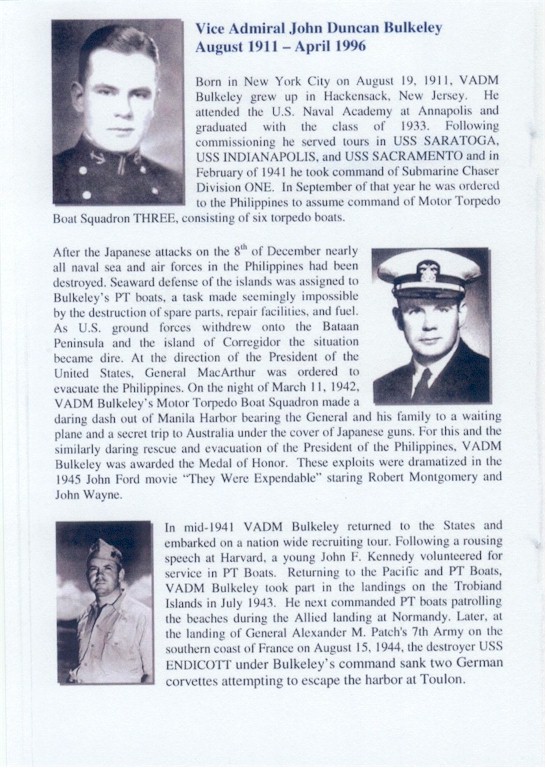 | 68k | Vice Admiral John Duncan Bulkeley's distinguished military career began when he graduated from the Naval Academy in 1933. He was decorated with the Congressional Medal of Honor for his many actions, which included the rescue of General Douglas MacArthur, his family and staff from Corregidor in 1942, by way of motor torpedo boat. Bulkeley's leadership during that experience in the Philippines has been immortalized in the movie "They Were Expendable." John Ford directed the film that starred Robert Montgomery as Bulkeley; the cast also includes John Wayne, Ward Bond and Donna Reed. At the age of 32, Bulkeley commanded more than 17,000 troops during the D-Day invasion. Bulkeley participated in the 50-Year Memorial of the D-Day invasion off the coast of Normandy where he reminded all in attendance that the true heroes of World War II were the ones who did not return. | Bill Gonyo |