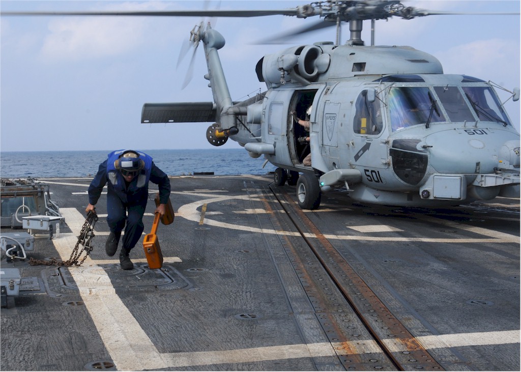 | 191k | 110311-N-5324W-117. Gulf of Aden, March 11 2011, Boatswain's Mate Seaman Tyler Behrens removes the chocks and chains from an SH-60B Sea Hawk helicopter assigned to the Vipers of Helicopter Anti-Submarine Squadron Light (HSL) 48 aboard the guided-missile destroyer USS Bulkeley (DDG 84). Bulkeley is on a routine deployment conducting maritime security operations in the U.S. 5th Fleet area of responsibility. U.S. Navy photo by Mass Communication Specialist Seaman Anna Wade. | Bill Gonyo |
