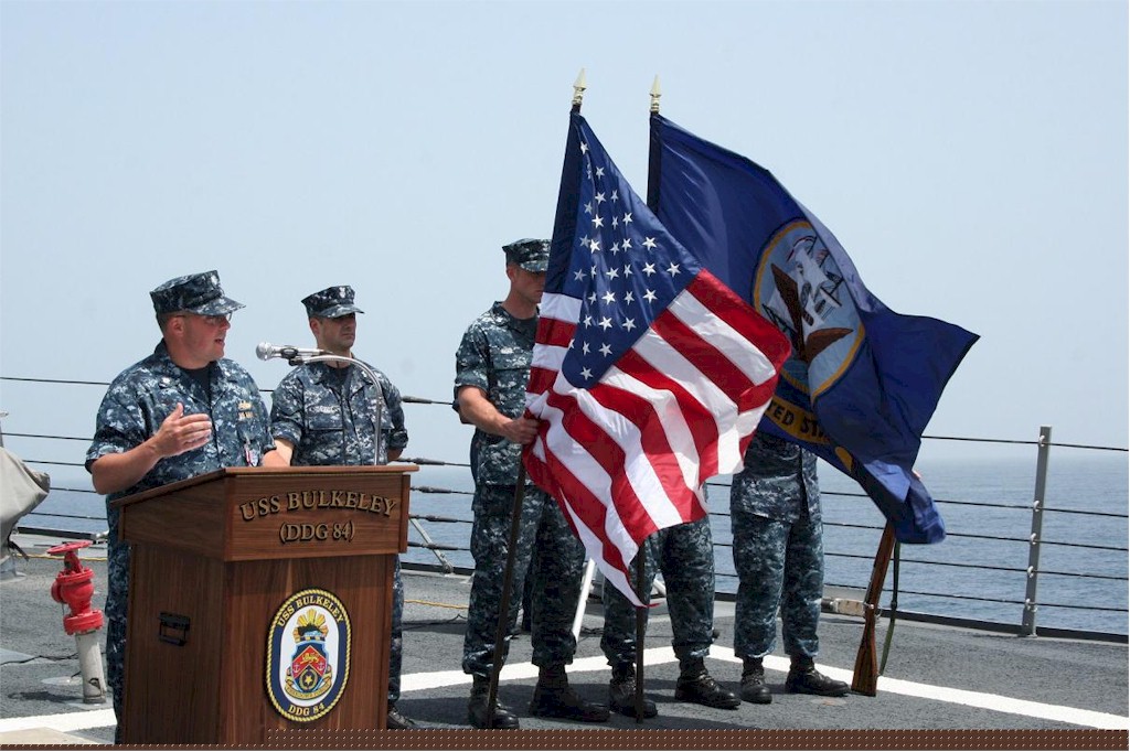 | 172k | 110319-N-UX598-161. Gulf of Aden, March 19 2011, Commander Christopher DeGregory speaks to the crew of the guided-missile destroyer USS Bulkeley (DDG 84) during his change of command ceremony while underway. US Navy photo by Mass Communication Specialist 1st Class Shawn Quinn. | Robert M. Cieri |