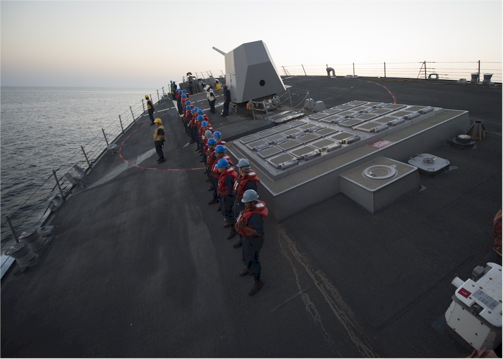 | 136k | Arabian Gulf, November 11 2013, sailors aboard the guided-missile destroyer USS Bulkeley (DDG 84) stand by during a break away high-speed turn following a replenishment at sea (RAS). Bulkeley is deployed as part of the Harry S. Truman Carrier Strike Group supporting maritime security operations and theater security cooperation efforts in the U.S. 5th Fleet area of responsibility. U.S. Navy photo by Mass Communication Specialist 3rd Class Shane A. Jackson, USN 131111-N-IG780-142. | Robert M. Cieri |