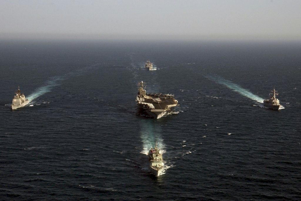 130k | USS George Washington (CVN-73), center, and (counterclockwise from right) guided missile destroyer USS Bulkeley (DDG-84), Military Sealift Command (MSC) Supply-class fast attack support ship USNS Supply (T-AOE 6), cruiser USS Vella Gulf (CG-72), and Halifax-class frigate Her Majesty's Canadian Ship (HMCS) Toronto (FFH-333) participate in a strike group photo while operating in the Arabian Gulf, 3 June 2004. The Norfolk, Va.-based aircraft carrier was on a scheduled deployment in support of Operation Iraqi Freedom (OIF). U.S. Navy photo by Photographer's Mate 1st Class Brien Aho (# 040603-N-5319A-008). | Fabio Peña |