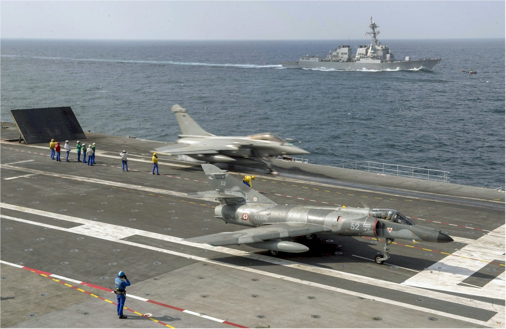 | 170k | 140102-N-ZZ999-198. Gulf of Oman, January 2 2014, the French NAVY aircraft carrier Charles de Gaulle (R 91) launches a Rafale marine jet as the guided-missile destroyer USS Bulkeley (DDG 84) is underway in the background. Charles de Gaulle, flagship for Task Force 473, is conducting operations with the Harry S. Truman Carrier Strike Group. U.S. Navy photo courtesy of the French navy by Chief Petty Officer Frederic Duplouich. | Robert M. Cieri |