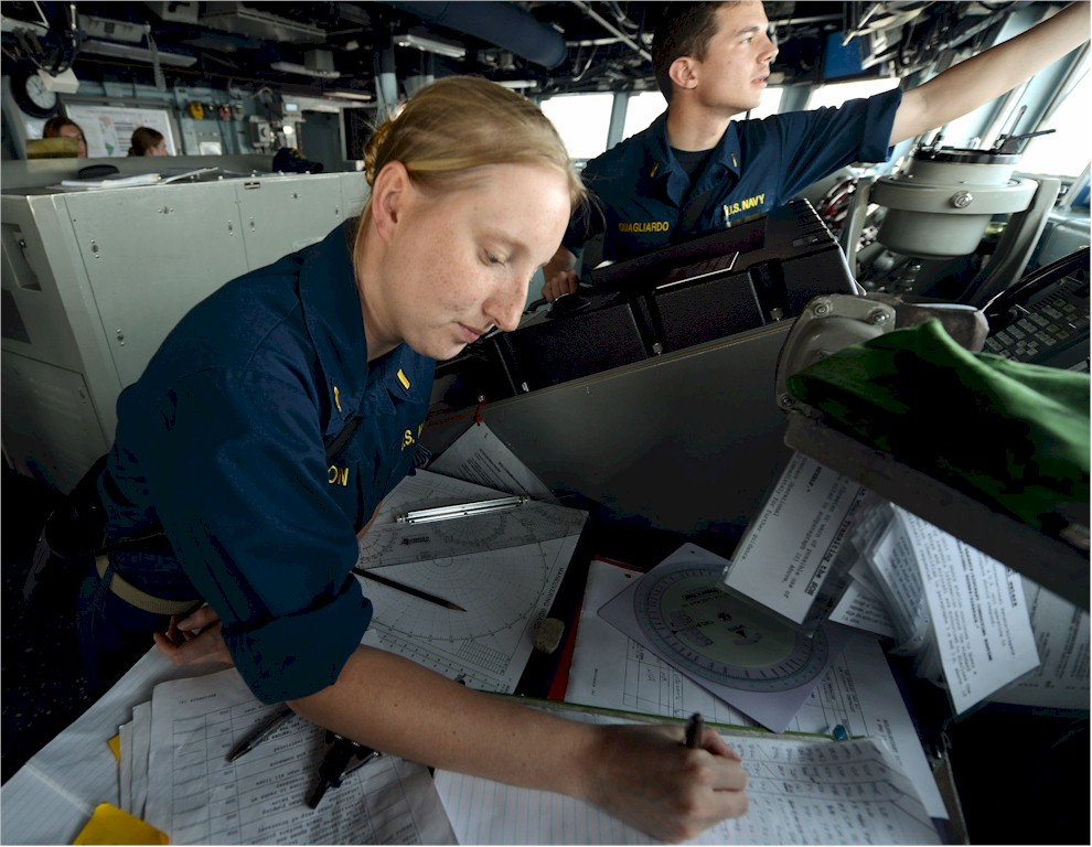 | 176k | 140325-N-MY642-144. Red Sea, March 25 2014, Ensign Nadine Harrison logs the ship's speed on the bridge of the guided-missile destroyer USS Bulkeley (DDG 84) during a replenishment-at-sea. Bulkeley is deployed as part of the Harry S. Truman Carrier Strike Group supporting maritime security operations and theater security cooperation efforts in the U.S. 5th Fleet area of responsibility. U.S. Navy photo by Mass Communication Specialist 2nd Class Donald R. White Jr. | Robert M. Cieri |