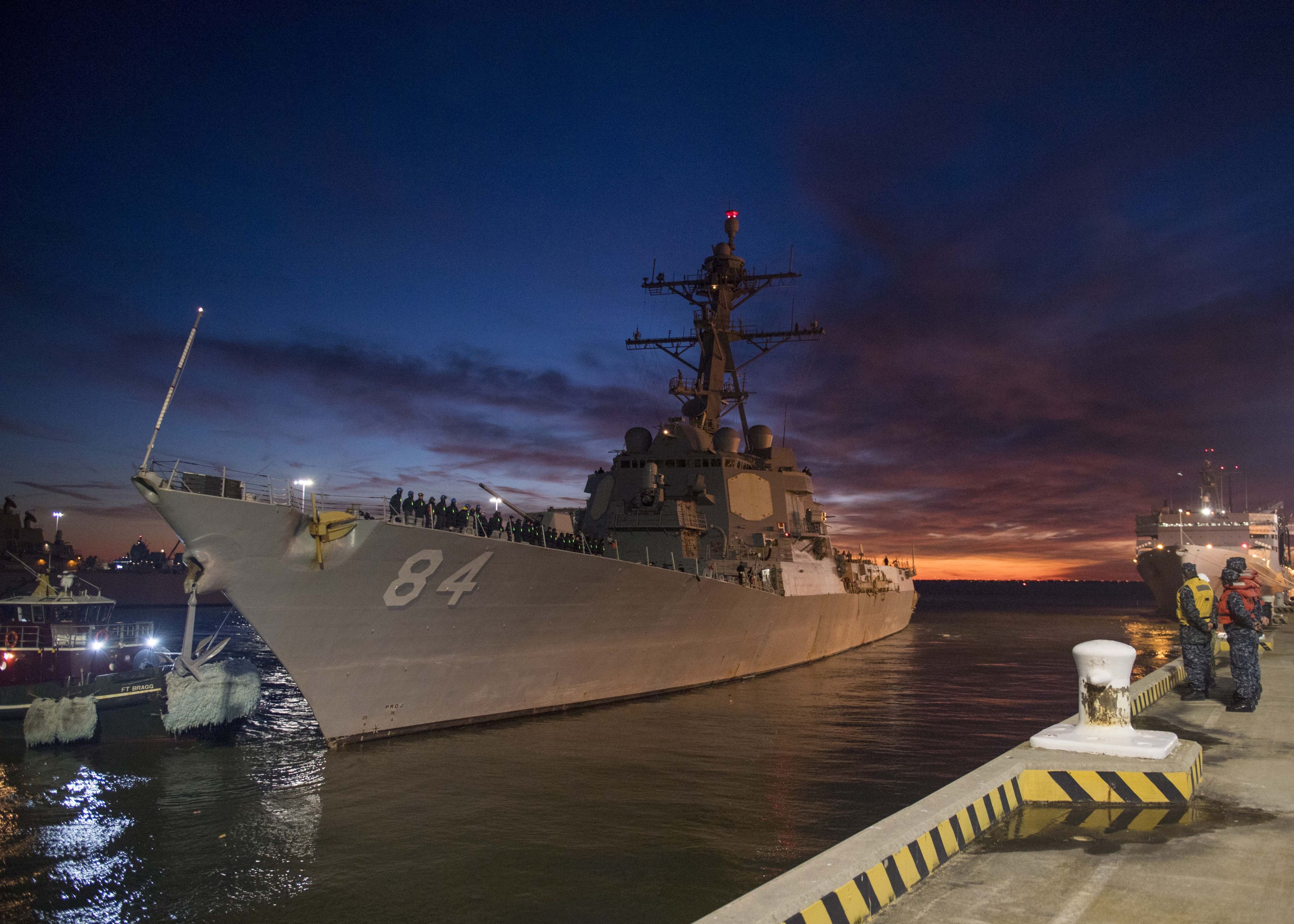 | 114k | 180131-N-SG189-0131 Norfolk, January 31, 2018. The guided-missile destroyer USS Bulkeley (DDG 84) departs Naval Station Norfolk. Bulkeley is underway for a composite training unit exercise (COMPTUEX), which evaluates the strike group's ability as a whole to carry out sustained combat operations from the sea, ultimately certifying the Harry S. Truman Carrier Strike Group for deployment. (U.S. Navy photo by Mass Communication Specialist Seaman Keith Wilson/Released) | Dave Wright |