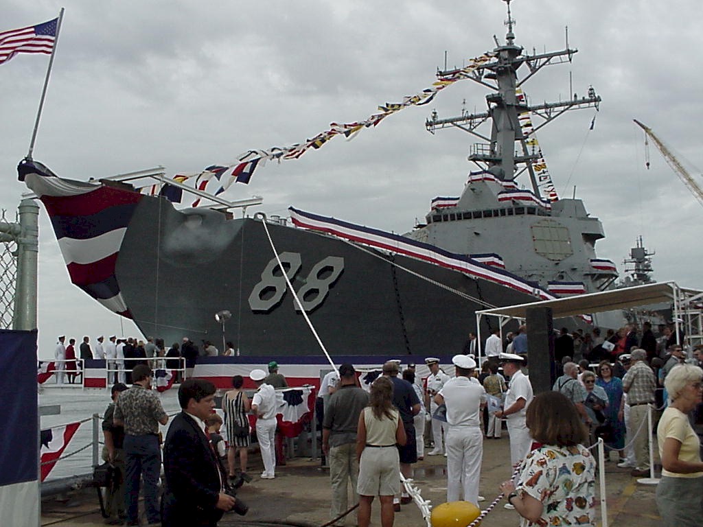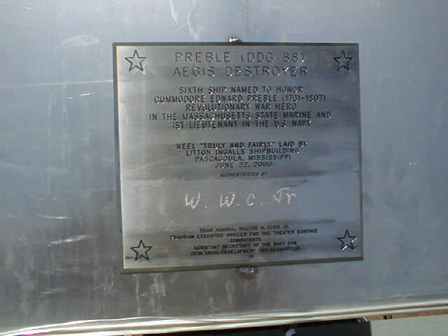 | 56k | DDG 88, the 17th DDG 51 Class Aegis guided missile destroyer to be built by Northrop Grumman Litton Ingalls Shipbuilding in Pascagoula, Mississippi, was launched on June 1 2001, and was christened "PREBLE" at Ingalls on Saturday, June 9. The public was invited to the christening ceremony at Ingalls, during which the new ship was officially named for Commodore Edward Preble, a Revolutionary War naval hero, and a pioneer in naval and merchant marine service. [Photo courtesy of Northrop Grumman Litton Ingalls Shipbuilding] | Bill Gonyo |
