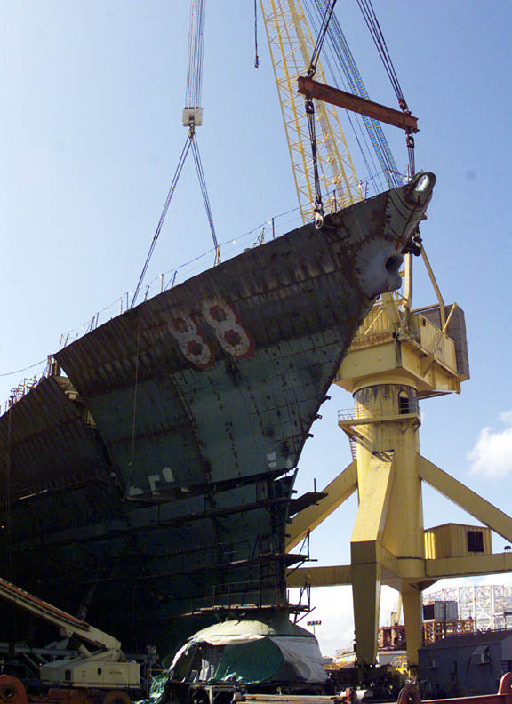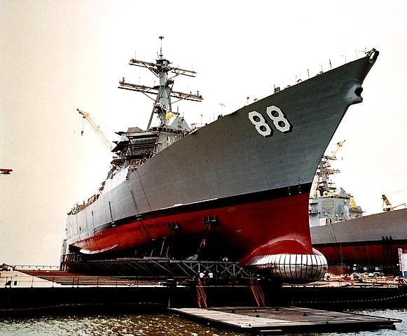| 70k | June 1 2001 Pascagoula, Mississippi: the Arleigh Burke Aegis class guided missile destroyer USS Preble (DDG 88) resting in the floating dry dock at the Litton Industries shipyard just prior to float off. Note the covered sonar dome. | Fred Weiss |