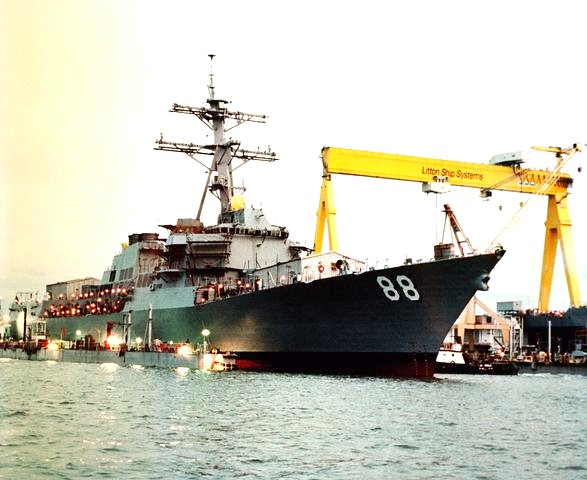 destroyer USS Preble (DDG 88) is eased forward out of the floating dry dock following the vessel`s float off at the Litton Industries shipyard. This starboard bow view shows the ship still inside the walls of the submerged dry dock. | Fred Weiss |