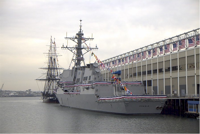 | 103k | 021109-N-0000X-001, Boston, Massachusetts November 9 2002, the guided missile destroyer USS Preble (DDG 88) held its commissioning ceremony on South Boston's Commonwealth Pier while moored bow to bow with USS Constitution, the world's oldest commissioned warship, commissioned on October 21st, 1797. The Preble is as the 64th Arleigh Burke-class guided missile destroyer. U.S. Navy photo | Bill Gonyo |