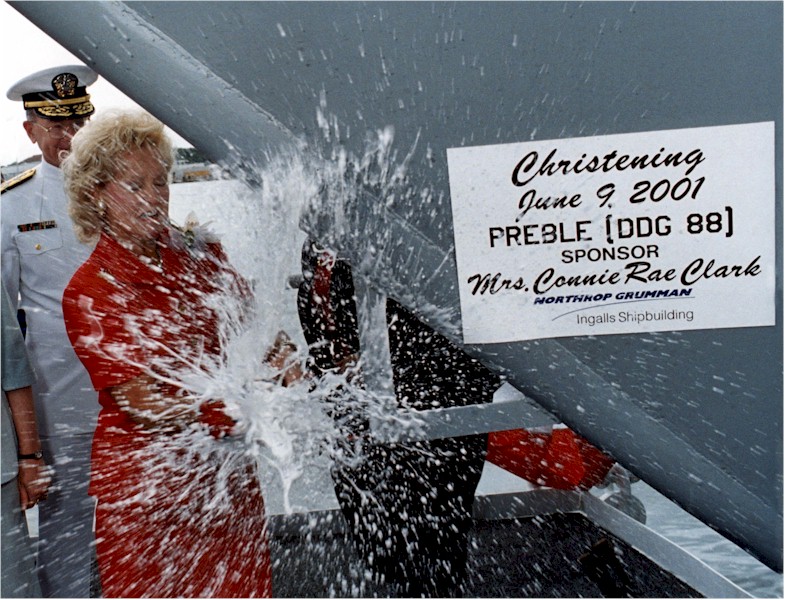 | 166k | Christening of the Preble (DDG-88) by her sponsor Mrs. Connie Rae Clark on June 9 2001. The CNO, Admiral Vern Clark, is standing behind her. | Bill Gonyo |