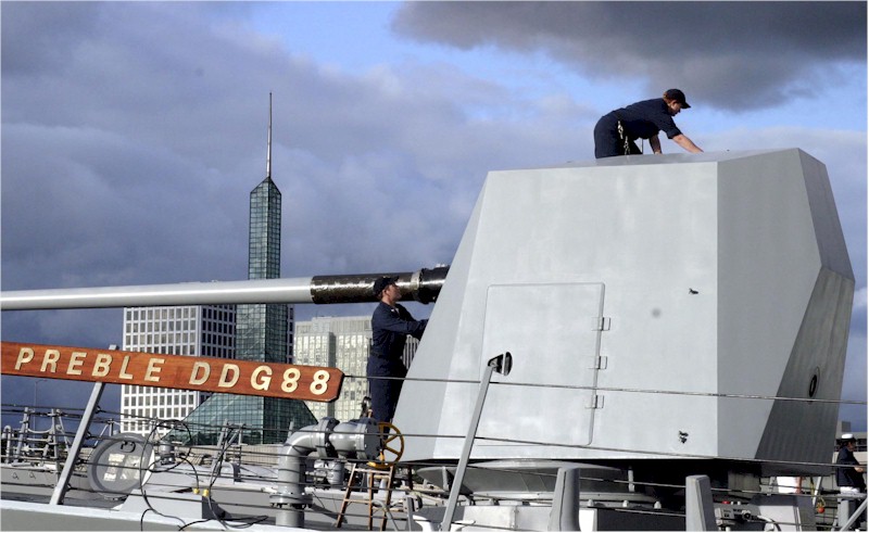 | 58k | USS Preble (DDG-88) during a Pre-aim Calibration Fire (PACFIRE) in August 2005. Note the wooden skids being used to cushion the impact of empty shell cases. US Navy photograph No. 050819-N-6932B-072. Courtesy of http://www.navweaps.com | Robert Hurst |
