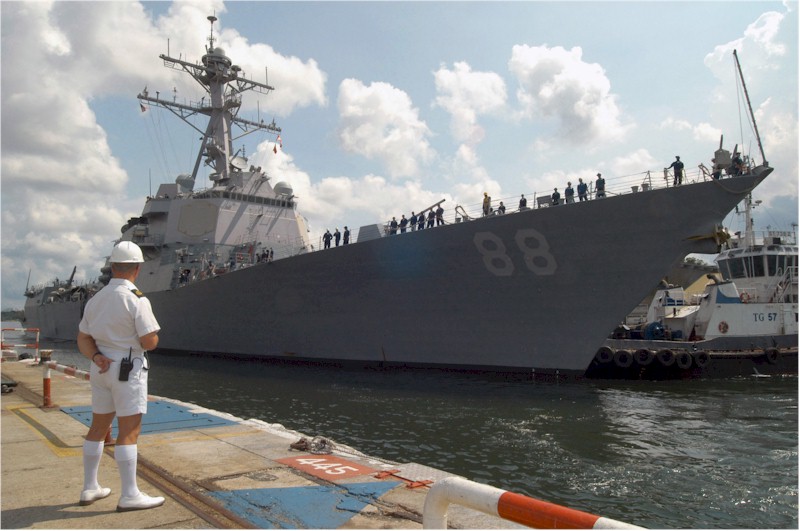 | 101k | British Royal Navy Chief Petty Officer Chuck Norris, Royal Navy Liaison Office, Singapore, inspects the Guided Missile Destroyer, USS PREBLE (DDG 88) as it docks at the Republic of Singapore Changi Naval Base, for a scheduled port visit after completing operations in the Persian Gulf with Expeditionary Strike Group 3. Taken 16 November 2004 by LT Chuck Bell. ID# DN-SD-06-13024. | Robert M. Cieri |