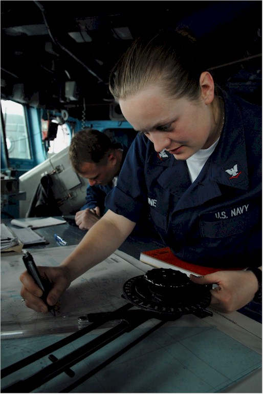 | 85k | 090226-N-2610F-282. Pacific Ocean, February 26 2009, Quartermaster 3rd Class Terra Maine, right, from Canon, Colo., takes navigation plot fixes on the bridge aboard the Arleigh Burke-class guided-missile destroyer USS Preble (DDG 88). Preble, as part of the John C. Stennis Carrier Strike Group, is on a scheduled six-month deployment to the western Pacific Ocean. U.S. Navy photo by Mass Communication Specialist 2nd Elliott Fabrizio. | Bill Gonyo |
