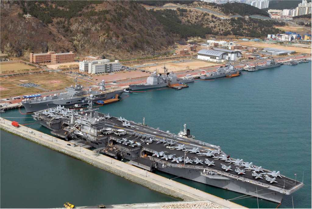 | 224k | 090312-N-1113S-290. Busan, Republic of Korea, March 12 2009, ships from the John C. Stennis Carrier Strike Group and U.S. 7th Fleet flagship USS Blue Ridge (LCC 19) are moored pier side at the Republic of Korea Navy Base Oryuk-Do in Busan. The strike group arrived March 11, while Blue Ridge pulled in March 5. Pictured from left are the aircraft carrier USS John C. Stennis (CVN 74), the amphibious command ship USS Blue Ridge, the guided-missile cruiser USS Antietam (CG 54) and the guided-missile destroyer USS Preble (DDG 88). U.S. Navy photo by Mass Communication Specialist 2nd Class Matthew Schwarz. | Robert M. Cieri |