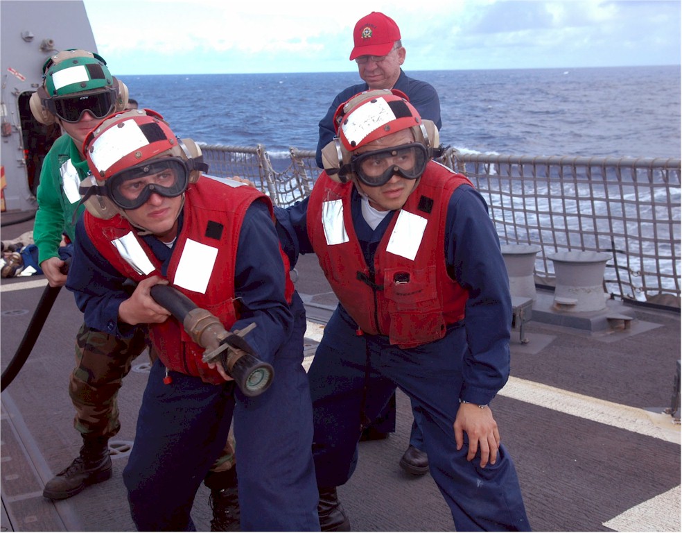 | 182k | 090519-N-4047W-027. Pacific Ocean, May 19 2009, Damage Control Training Team member Senior Chief Damage Controlman Raul Sanchez supervises a hose team during a flight deck fire drill aboard the Arleigh Burke-class guided-missile destroyer USS Preble (DDG 88). Preble, as part of the John C. Stennis Carrier Strike Group, is on a scheduled six-month deployment to the western Pacific Ocean. U.S. Navy photo by Mass Communication Specialist 2nd Class Shannon Warner. | Bill Gonyo |