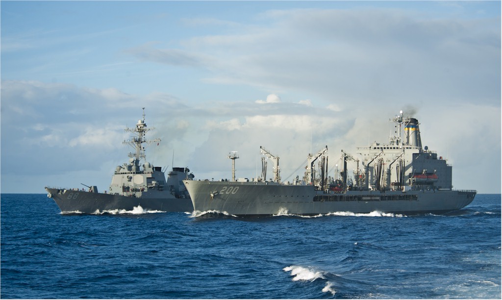 | 129k | 130429-N-LP801-121. Pacific Ocean, April 29 2013, the Arleigh Burke-class guided-missile destroyer USS Preble (DDG 88) and the Military Sealift Command fleet replenishment oiler USNS Guadalupe (T-AO 200) conduct a replenishment-at-sea. Preble and Momsen are deployed with Carrier Strike Group (CSG) 11 to the western Pacific region. U.S. Navy photo by Mass Communication Specialist 3rd Class Raul Moreno Jr. | Lee Wahler |