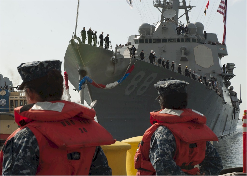 | 161k | 130419-N-DH124-125. San Diego, April 19 2013, the Arleigh Burke-class guided-missile destroyer USS Preble (DDG 88) departs homeport San Diego, April 19, for a six-month deployment to the 7th Fleet area of operations. While deployed, Preble is scheduled to participate in Cooperation and Readiness Afloat Training (CARAT) with partner nations in the region. U.S. Navy photo by Mass Communication Specialist 2nd Class Rosalie Garcia. | Ron Reeves |