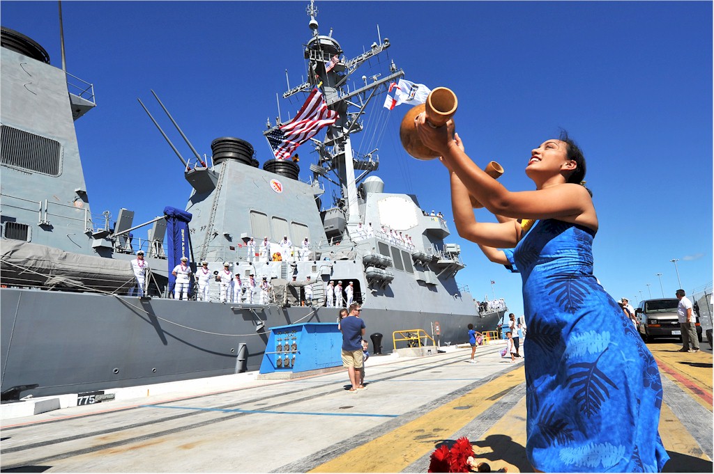 | 209k | 140814-N-IU636-226. Pearl Harbor, August 14 2014, traditional Hawaiian dancers greet the crew of the guided-missile destroyer USS Preble (DDG 88) upon the ship's arrival at its new homeport at Joint Base Pearl Harbor-Hickam. Preble replaced the guided-missile frigate USS Reuben James (FFG 57), which was decommissioned July 18, 2013. Preble will serve as a middle Pacific surface combatant to aid and reinforce maritime operations. U.S. Navy photo by Mass Communication Specialist 3rd Class Johans Chavarro. | Ron Reeves |