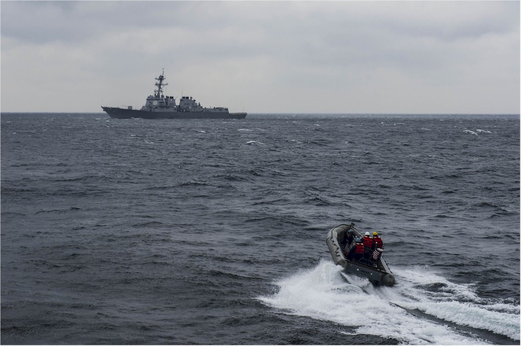 | 160k | 150408-N-ZZ786-134. Waters South of Japan, April 8 2015, a rigid-hull inflatable boat assigned to the Arleigh Burke-class guided-missile cruiser USS Mustin (DDG-89) transits to the Arleigh Burke-class guided-missile cruiser USS Preble (DDG-88) for a personnel transfer. Mustin is on patrol in the U.S. 7th Fleet area of responsibility in support of security and stability in the Indo-Asia-Pacific region. U.S. Navy photo by Mass Communication Specialist David Flewellyn. | Ron Reeves |