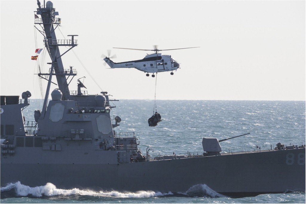 | 115k | 150719-N-TW634-108. Indian Ocean, July 19 2015, an SA-330 Puma helicopter conducts a vertical replenishment with the guided-missile destroyer USS Preble (DDG 88). Preble is on patrol in the U.S. 7th Fleet area of operations. U.S. Navy photo by Mass Communication Specialist 3rd Class Derek A. Harkins. | Ron Reeves |