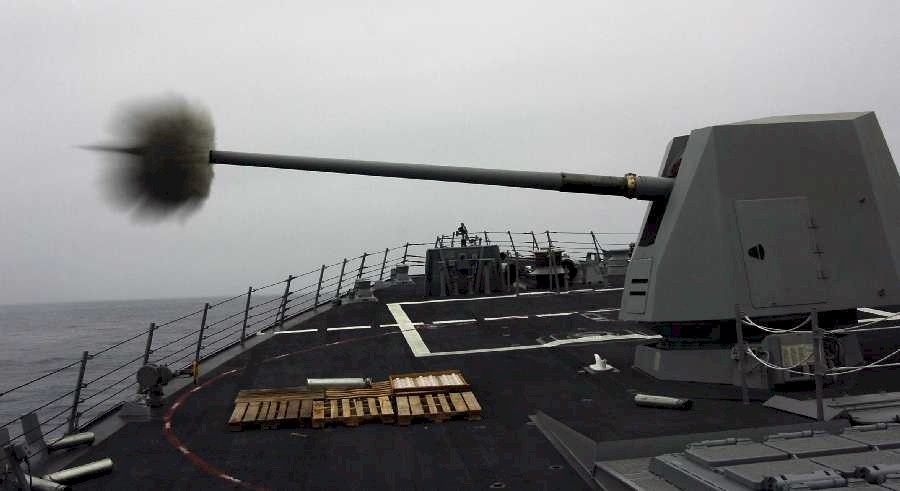 | 78k | USS Preble, February 18 2003, as part of her Combat System Ships Qualification Test (CSSQT), the crew of USS Preble (DDG 88) fires live ammunition from a 5-inch 62-caliber gun. The gun can fire at a rate of up to 20 rounds per minute. | Fred Weiss |
