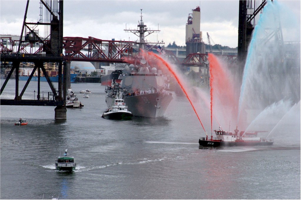 | 167k | A Portland fire boat greets the guided missile destroyer USS Preble (DDG-88) assisted by the tug America with red white and blue water streams as she passes under the Willamette river’s Steel Bridge. Preble is one of four U.S. Navy ships visiting Portland for the week long 99th annual Rose Festival celebration, 8 June 2006. U.S. Navy photo by Mass Communication Specialist First Class Thomas Brennan. United States Navy NewsStand ID 060608-N-7783B-001. | Robert Hurst |