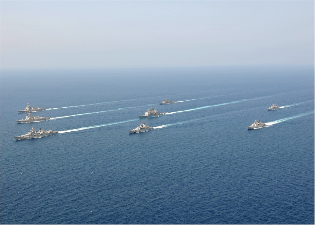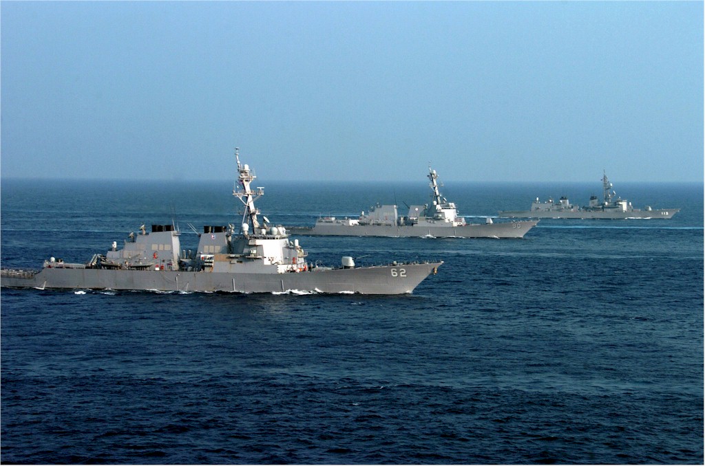 | 145k | 100502-N-2013O-003. Indian Ocean, May 2 2010, Arleigh Burke-class guided-missile destroyers USS Lassen (DDG 82) and USS Chafee (DDG 90), Ticonderoga-class guided-missile cruiser USS Shiloh (CG 67) and Oliver Hazard Perry-class guided-missile frigate USS Curts (FFG 38) sail in formation with ships from the Indian navy after completing exercise Malabar 2010 in the Indian Ocean. Exercise Malabar is an annual bilateral exercise in which the U.S. and Indian navies participate. U. S. Navy photo by MC3 Charles Oki. | Robert M. Cieri |