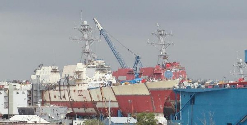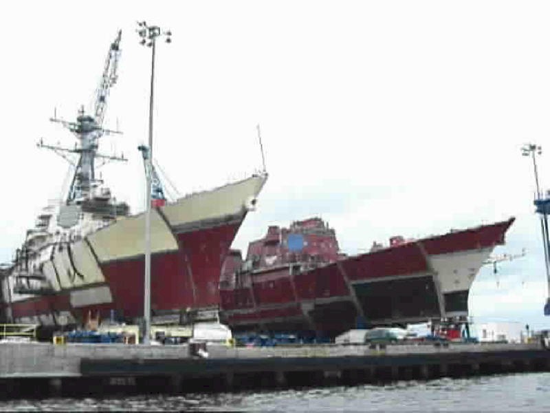 | 63k | USS Chafee (DDG-90) (foreground) and USS Momsen (DDG-92) under construction at Bath Iron Works. | Robert Hurst |