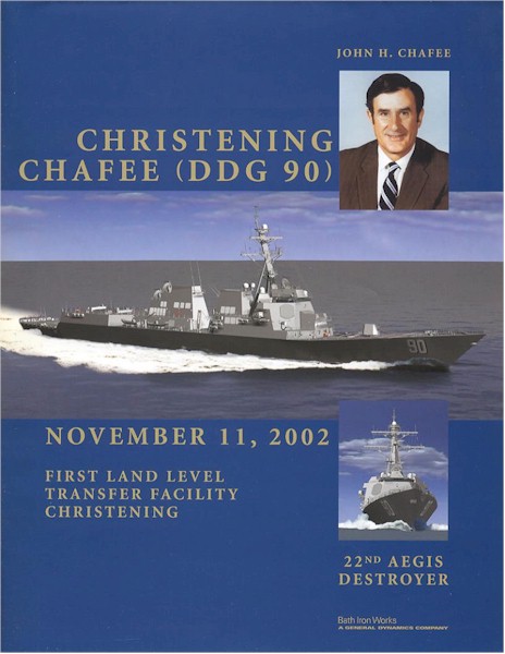 | 72k | Chafee is the fortieth destroyer of the Arleigh Burke class and the twenty-second to be built by Bath Iron Works. She is named after Senator John Hubbard Chafee, R.I., (1922-1999), who distinguished himself as a U.S. senator, Secretary of the Navy, Rhode Island governor, and war hero -- a Marine veteran of Guadalcanal with service as both an enlisted man and commissioned officer. Photo and information is from the U.S. Government World Wide Web site for official information about PCU CHAFEE. | USN |