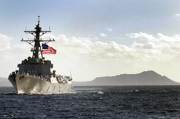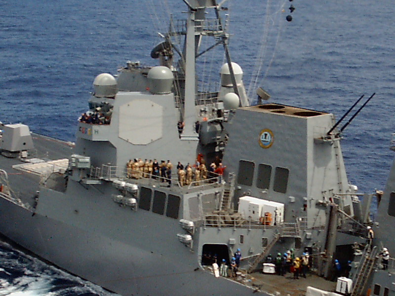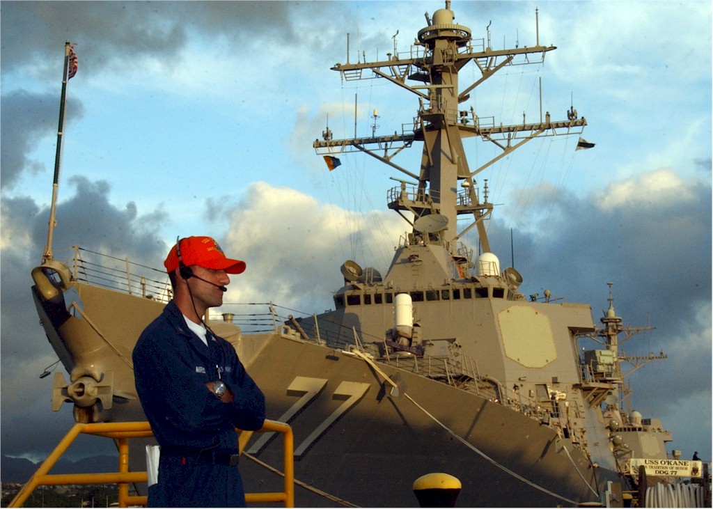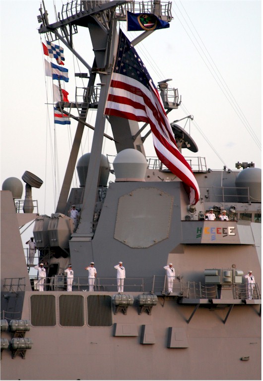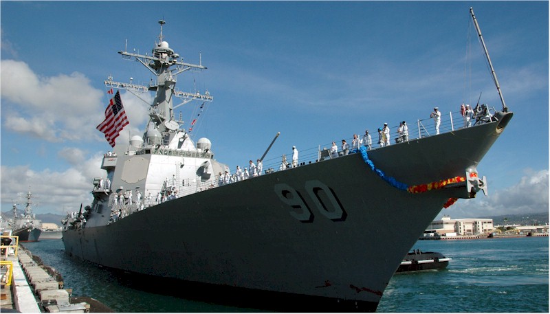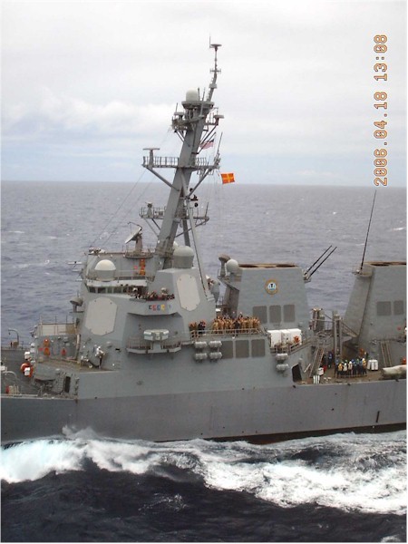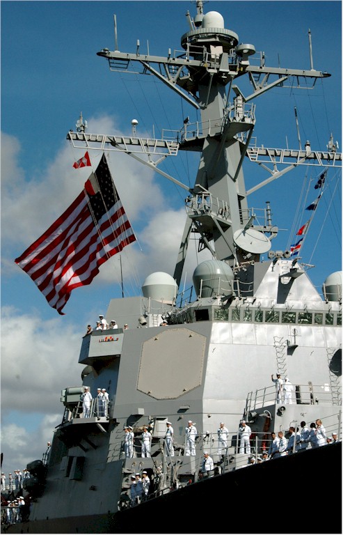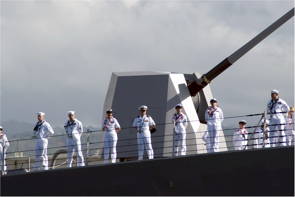 | 109k | U.S. Navy Sailors man the rails aboard the guided missile destroyer USS Chafee (DDG 90) as she returns to Pearl Harbor, Hawaii, from a six-month deployment as part of the Nimitz Carrier Strike Group in support of the war on terror November 9 2005. U.S. Navy photo by Journalist 3rd Class Ryan C. McGinley, 051109-N-3019M-006. | Bill Gonyo |