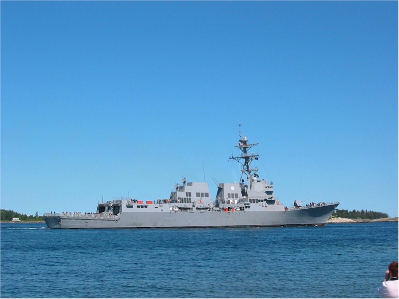 | 89k | June 16 2003, CHAFEE exiting the Kennebec River as she heads out to sea for combined A/B (Builders) Sea Trials. The picture was taken from Fort Popham. Note the orange containers on the aft VLS deck, they held life vests for the 400(!) folks that rode her for sea trials. | Bill Gonyo/CDR Armando Ramirez, USN Interoperability Branch Chief J-8/JIAMDO |