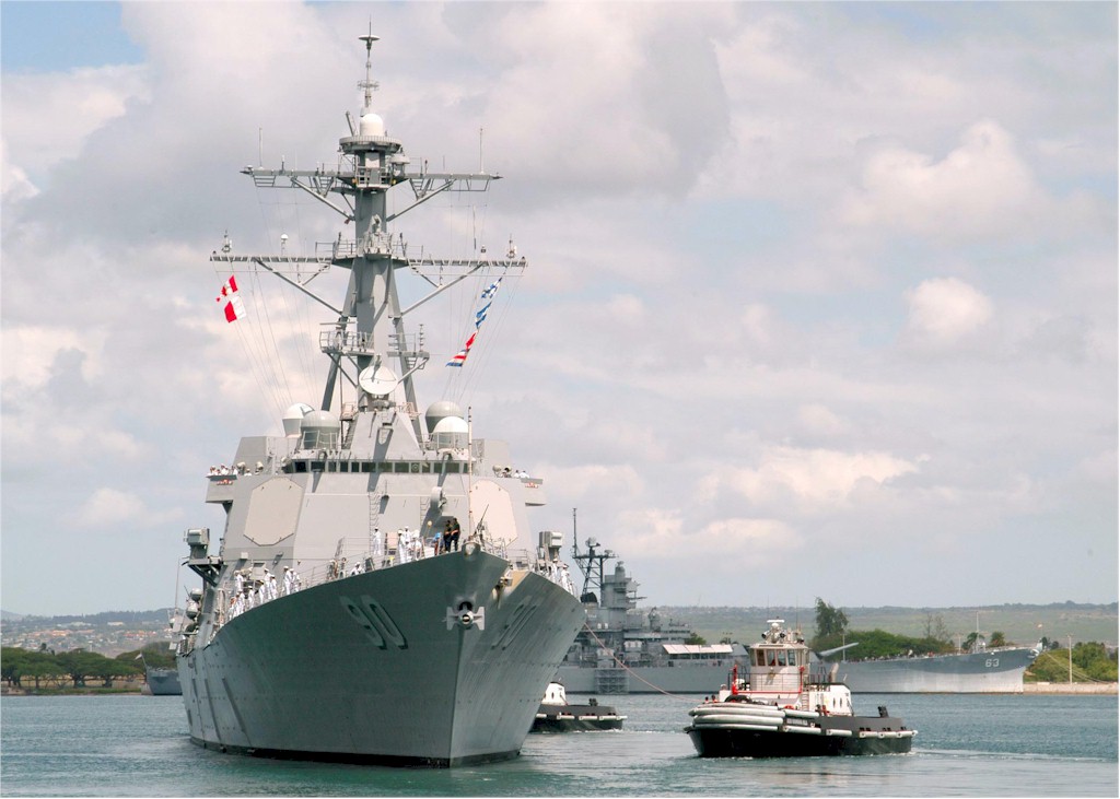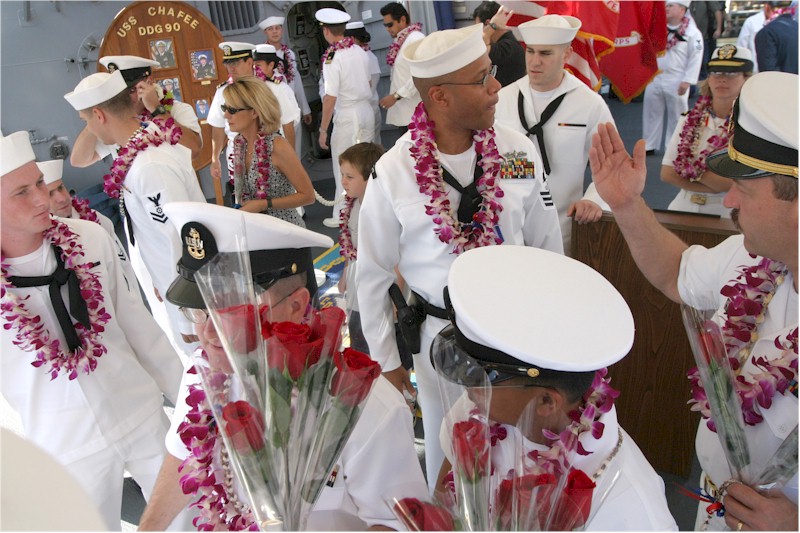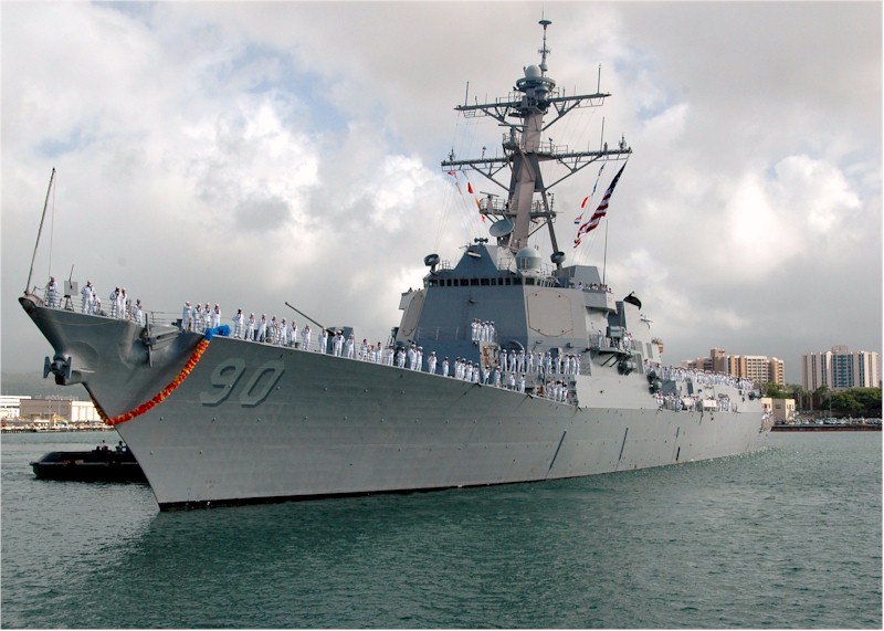 | 84k | 070922-N-0879R-006. Pearl Harbor, HI, September 22 2007, guided-missile destroyer USS Chafee (DDG 90) pulls into port after a deployment with Nimitz Carrier Strike Group. Chafee departed on April 9 and joined the Nimitz Carrier Strike Group to conduct operations in support of the global war on terrorism.U.S. Navy photo by Chief Mass Communication Specialist David Rush. | Bill Gonyo |