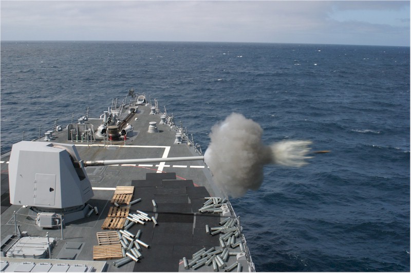 | 103k | Undated, location unknown. The guided missile destroyer USS Chafee (DDG-90) fires a five-inch round from a Mk-45 5-inch gun during a live-fire exercise. U.S. Navy Photograph by IS1 Joshua Busey. | Bill Gonyo |