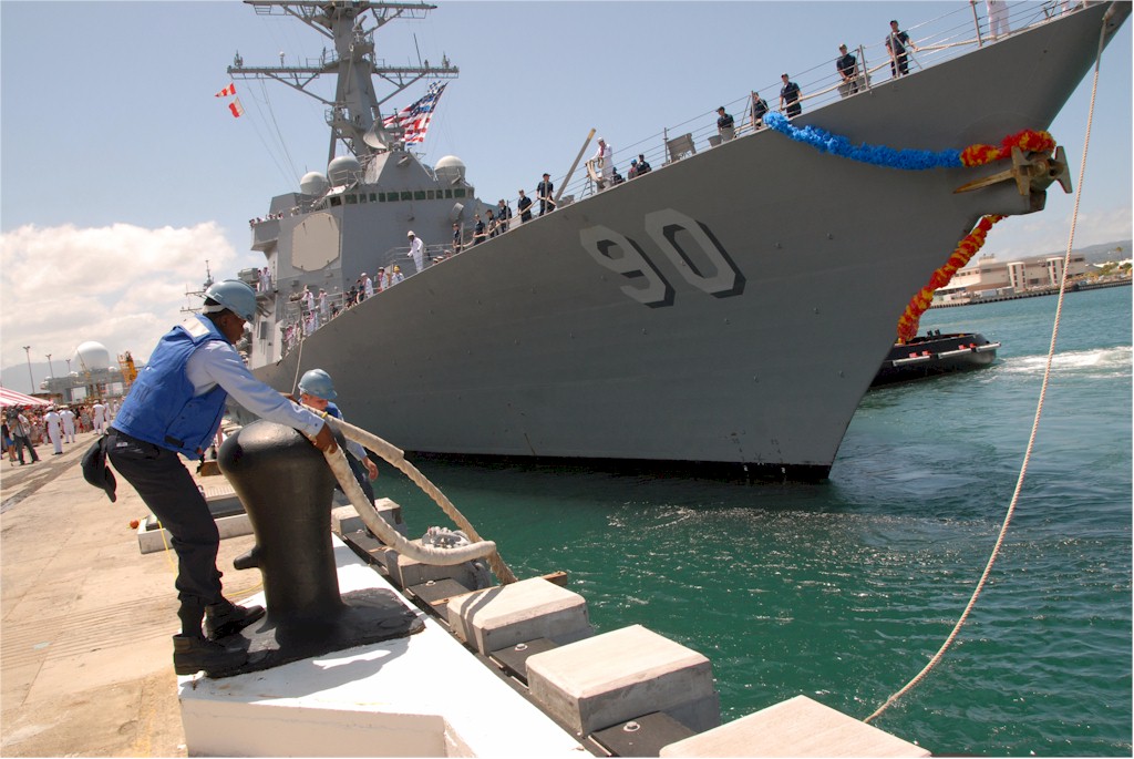 | 169k | 080607-N-4965F-234. Pearl Harbor, Hawaii, June 7 2008, sailors assigned to the guided-missile destroyer USS Paul Hamilton (DDG 60) perform line handlers for the Arleigh Burke-class guided-missile destroyer USS Chafee (DDG 90) as she moors pier side at Naval Station Pearl Harbor after a four-month deployment. U.S. Navy photo by Mass Communication Specialist 1st Class James E. Foehl. | Robert M. Cieri |