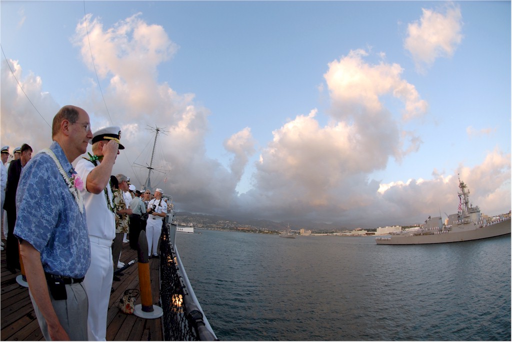 | 135k | 080718-N-5476H-092. Pearl Harbor, July 18 2008, Secretary of the Navy (SECNAV) The Honorable Dr. Donald C. Winter and Adm. Robert F. Willard, commander, U.S. Pacific Fleet, render honors as the guided-missile destroyer USS Chafee (DDG 90) and the guided-missile frigate USS Crommelin (FFG 37) pass in review during the Navy's Great White Fleet Gala at the Battleship Missouri Memorial. This marks the 100th anniversary of the Great White Fleet's arrival to Hawaii. U.S. Navy photo by Mass Communication Specialist 2nd Class Michael Hight. | Robert M. Cieri |